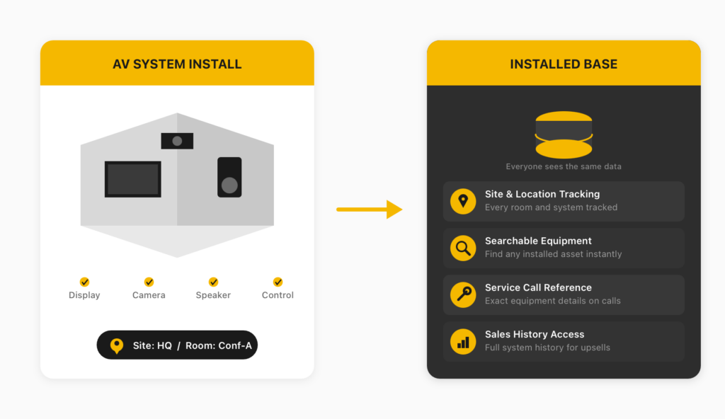 When an AV system is installed, the equipment becomes part of the customer’s installed base. That installed base drives service calls, upgrades, and renewals. Technicians, project managers, and sales all see the same system information.