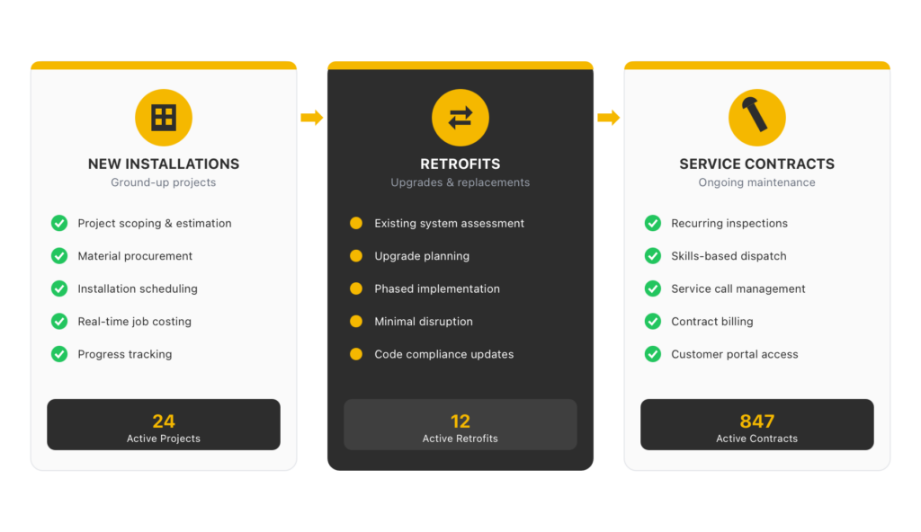 Many life safety firms run large installation projects alongside long-term service contracts. Q360 handles both — with real-time job costing, resource scheduling, and seamless hand-offs between install and service teams.