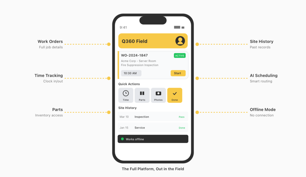 Time, parts, photos, notes, and signatures flow directly back to Q360 the moment connectivity is restored.