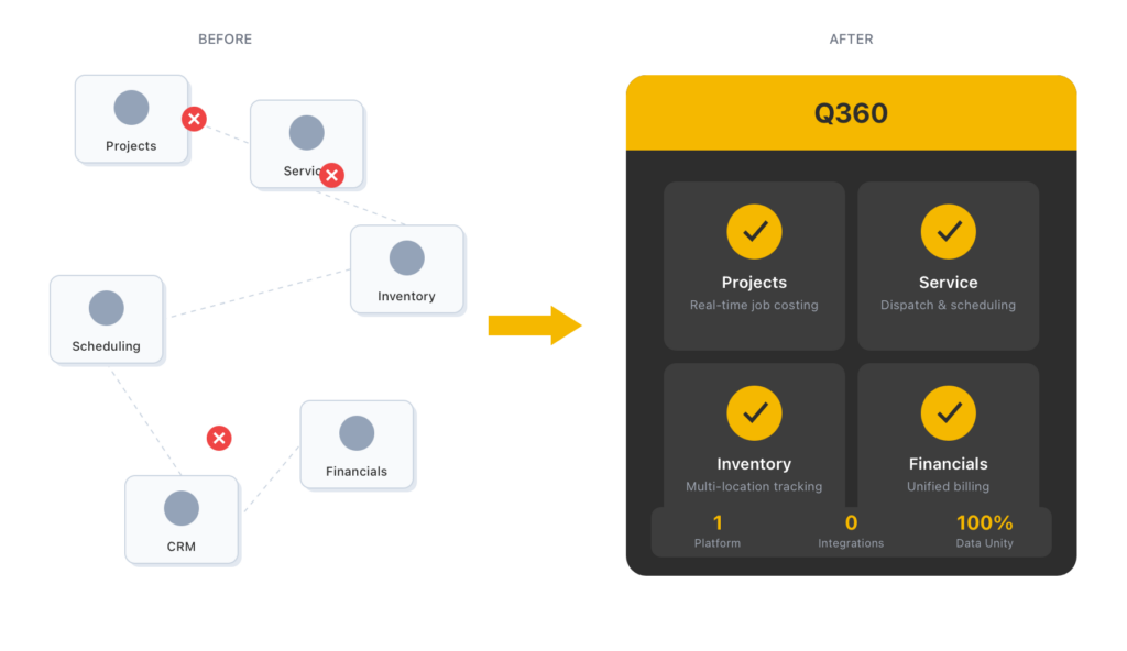 Q360 acts as the operational backbone of the business. Projects, service, inventory, and financials all run on one platform—reducing the number of systems IT must maintain and integrate.